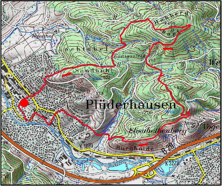 Wir folgen dem Wegezeichen rotes Kreuz, queren die Hauptstraße, gelangen über das Schwarze Wegle, die Mozartstraße, die Welzheimerstraße zum Reesenbänkle. Nun folgen wir dem Wegzeichen blauer Punkt halbrechts durch die Rothenbergstraße, dann durch Streuobstwiesen aufwärts zum Sandbühl und genießen unterwegs die schönsten Ausblicke auf Plüderhausen.